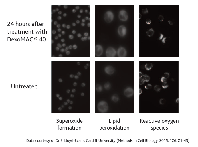 Using dextran coated nanoparticles for separation of sub-cellular organelles does not affect the shape, structure or performance of the organelle. Testing for superoxides, Lipid peroxidation and reactive oxygen species show very little difference between untreated cells and those treated with DexoMAG ® 40 (CHO-H1 cell line).